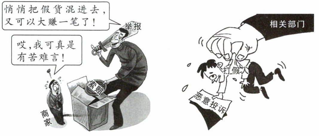 11.(2025重庆一中定时作业)“职业打假”是指通过购买或消费假冒、不合格产品或服务后依据法律获得惩罚性赔偿,并以获得此赔偿为其主要收入来源的职业活动。“职业打假”在揭露假货、帮助消费者维权的同时,也存在部分“打假人”恶意投诉等“假打”乱象。请阅读下面的漫画,运用所学知识,回答问题。(6分)