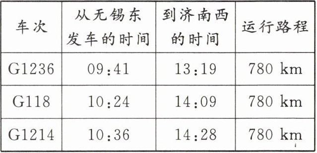 (2)根据列车时刻表知道,乘坐G118到达济南西所用时间$t' = 3.75\ h$,总路程$s' = 780\ km$,高铁运行的平均速度$v'=\frac{s'}{t'}=\frac{780\ km}{3.75\ h} = 208\ km/h$。