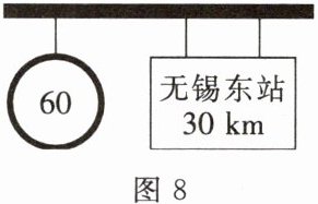 11. 某同学的爸爸驾车带他到无锡东站,然后一起乘高铁去济南旅游。9:30,他们开车出发,看到路边如图8所示的交通标志牌。此时该同学通过售票软件查询到的部分列车的时刻表(有改动)如下。