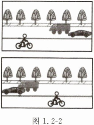 7. 某同学在马路边拍街景照片,在同一个位置连续拍了两张,如图 1.2 - 2 所示。如果卡车是向西运动的,以行驶的卡车为参照物,树是
