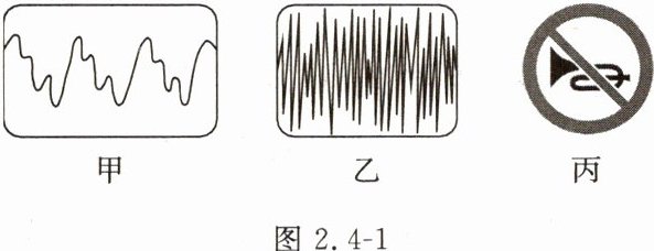 图2.4 - 1中的甲图和乙图是乐音和噪声的波形图,乙图中的属于噪声。控制噪声、减弱噪声有三条途径,丙图的交通标志是在声源处控制噪声。环保部门常在噪声较大的街头设置噪声监测仪,噪声监测仪不具有(选填“具有”或“不具有”)降低所在路段噪声的作用。