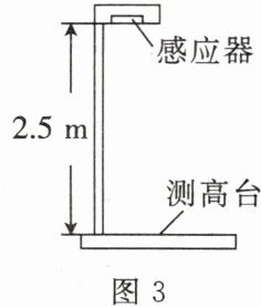 5. 图3所示为一种身高测量仪,其顶部的感应器竖直向下发射超声波信号,经下方物体反射后返回,被感应器接收。某同学站上测高台,感应器记录信号从发射到接收所经历的时间为$5×10⁻^3s。$已知感应器距测高台的高度为2.5m,空气中的声速取340m/s,则该同学的身高为(