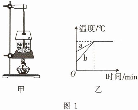 1. 在“探究水沸腾时温度变化的特点”实验中,a、b 两组同学在同一间教室里用如图 1 甲所示的装置分别进行实验,并根据实验数据绘制了如图 1 乙所示的图像。