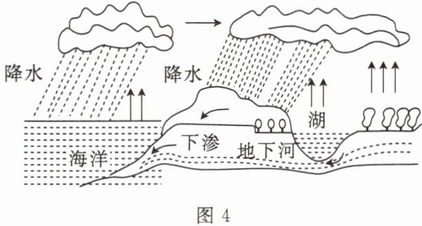 4. 图 4 是大自然中水循环现象的示意图。江、河、湖、海以及大地表层中的水不断蒸发变成水蒸气,当含有很多水蒸气的空气升人高空时,水蒸气的温度降低,化成小水滴(①)或凝成小冰晶(②),这就是云。这些小水滴和小冰晶在一定条件下会下落。在下落过程中,小冰晶也变成小水滴(③)与原来的小水滴一起落到地面,这就是雨。