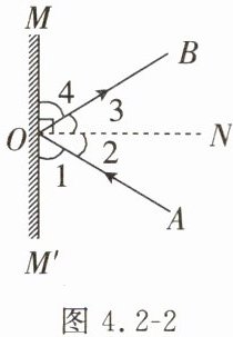 图4.2−2反映的是光线在物体表面发生反射的情况, MM’ 表示反射面, AO 表示入射光线, O 点表示入射点, OB 表示反射光线, ON 表示法线, ∠2(或∠AON) 是入射角, ∠3(或∠NOB) 是反射角。