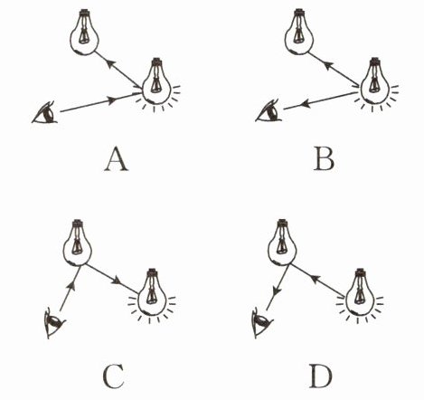 7. 黑暗的房间里有两盏电灯,只有一盏灯点亮,但人能看到未点亮的灯泡。以下是人看到未点亮的灯泡的光路图的是(