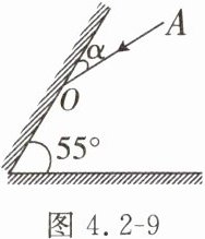 8. 如图4.2 - 9所示,两个平面镜成$55^{\circ}$角,一束光$AO$射到其中一个平面镜上。要使光经另一个平面镜反射后从$OA$射出,则$\alpha=$