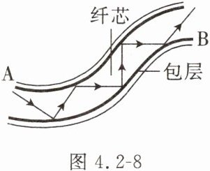 如图4.2−8所示,光沿直线进入光纤,在纤芯与包层的界面上多次 反射 ,从A端到达B端。