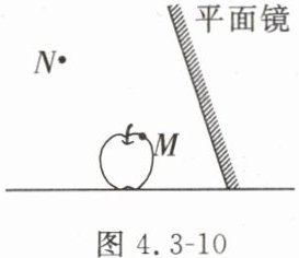 10. 如图4.3-10所示,M是苹果上的一点,N是人眼的位置。请画出M点在平面镜中的像M'及M点发出的一条光线经平面镜反射后经过N点的光路图。