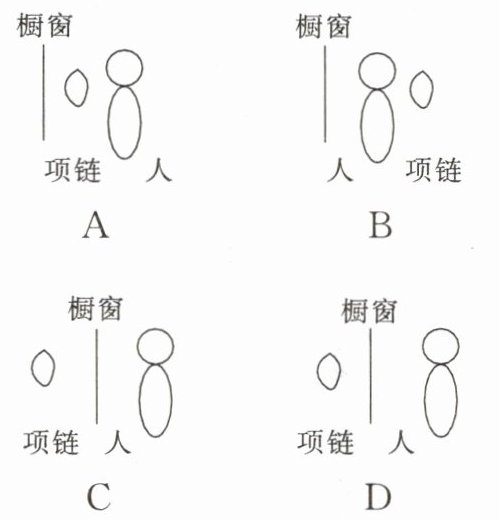 9. 在商店的橱窗里,透明支架上摆放着项链,顾客需要看试戴效果时,不取出项链,而是站在橱窗前适当位置处,橱窗上就会照出项链戴在自己脖子上的样子。下列表示项链与人的位置关系的示意图中正确的是(