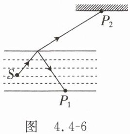 10. 如图4.4-6所示,游泳池中的水面下方的光源S发出的一束光经水面反射后在池底产生光斑$P_1,$折射光在天花板上产生光斑$P_2。$若水面下降一小段距离,则(