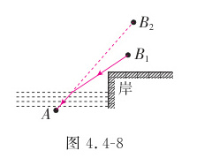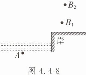 12. 如图4.4-8所示,潜水员的眼睛在水面以下A处,观察岸上的物体。图中的两个点$B_1$和$B_2$分别是物、像的位置。请在图中作出潜水员观察物体的光路图。