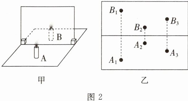 (3) 改变蜡烛 $ A $ 的位置,进行三次实验。用直线将物和像的位置连接起来,如图 2 乙所示,发现像和物的连线与镜面