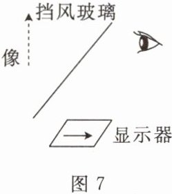 15. 为了避免驾驶员在汽车行驶时低头看仪表造成事故,人们发明了抬头显示系统,图 7 是它的工作原理图。抬头显示系统能将水平显示器上的行车数据通过前挡风玻璃呈现在驾驶员的正前方,驾驶员透过挡风玻璃(看作平面镜)往正前方观看的时候,能够将车外的景象与竖直呈现的行车数据融合在一起。下列说法正确的是(