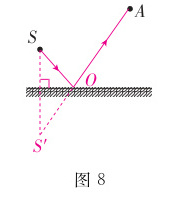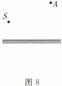 16. 根据平面镜成像的特点,画出图 8 中点光源 S 发出的光经平面镜反射后过 A 点的反射光线。