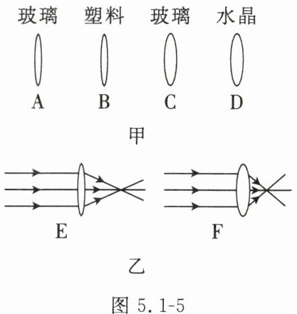 (选填字母)两个凸透镜做实验。(2)器材确定后,小组同学让一束与主光轴平行的光分别经过两个凸透镜后会聚于焦点处,如图5.1-5乙E、F所示。比较两次实验的现象,可以得出结论:凸透镜表面越凸,凸透镜的焦距越
