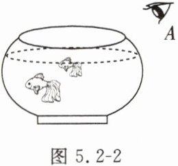 5. 如图 5.2-2 所示,鱼缸中只有一条小金鱼,眼睛从 A 点却可以观察到两条,一条鱼的位置变浅,另一条鱼变大。前者是由光的
