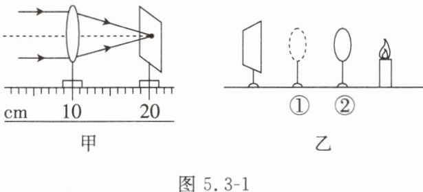 (2) 如图5.3-1乙所示,某同学将蜡烛、光屏位置固定后,左右移动凸透镜,凸透镜在①②两个位置时,光屏上都能得到倒立的清晰的像,则与透镜在①位置相比,在②位置时,所得到的像