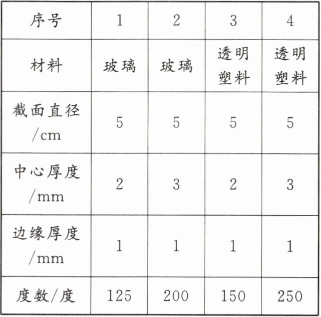 9. 某同学在新课结束后发现,有些同学的眼镜镜片是用玻璃做的,有的是用塑料做的。进一步观察发现,即使凸起程度相同的远视眼镜,用不同材料制作后,度数也会不同。由此,该同学提出猜想:远视镜片的度数可能与