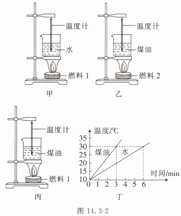 (选填“加热时间”或“温度计上升的示数”)来比较水和煤油吸收热量的多少。(2)图14.3-2丁为经过实验得出的水和煤油的温度随时间变化的图像。根据图丁可以判断出