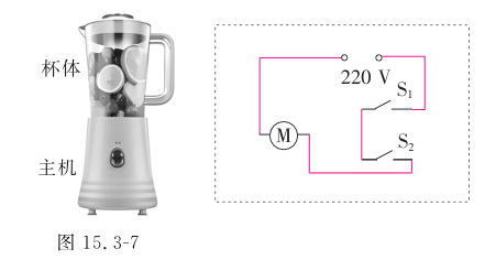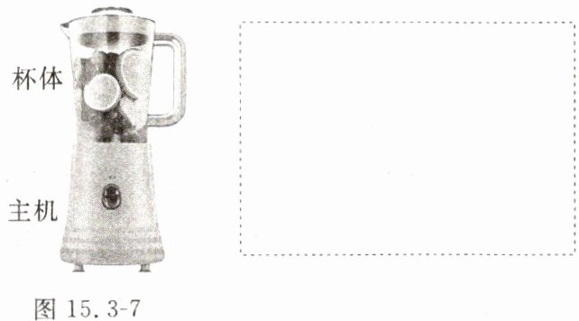 8. 图15.3-7是某榨汁机的外形图。该品牌的榨汁机设有电源开关$ S_1$和安全开关$ S_2$,当杯体放在主机上时,安全开关$ S_2$自动闭合,此时再闭合电源开关$ S_1$,电动机才能启动,开始榨汁。请按以上要求在虚线框中画出该榨汁机的电路图。