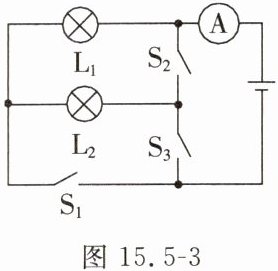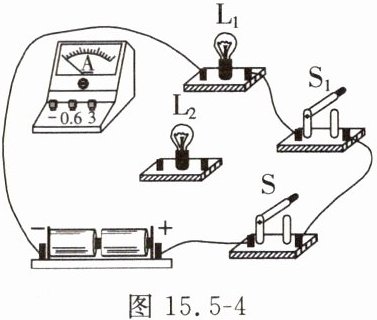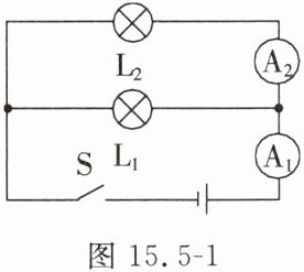 2. 如图 15.5-1 所示的电路中,S 闭合时,电流表$A_1$和$A_2$的示数分别是 0.5 A 和 0.3 A,则通过灯$L_1$的电流是