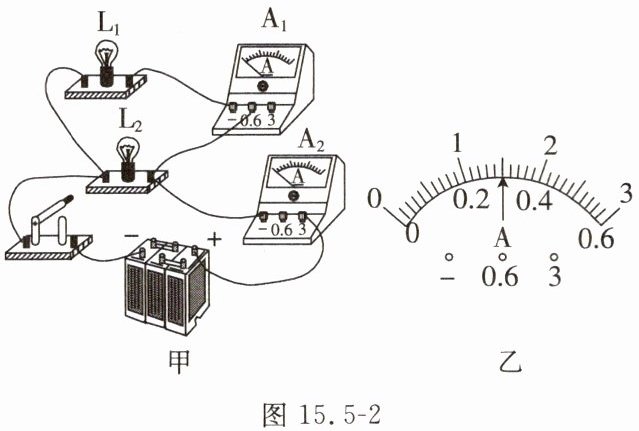 3.(多选)如图 15.5-2 甲所示电路中,闭合开关后两灯正常发光,两电流表指针位置均如图 15.5-2 乙所示,则(