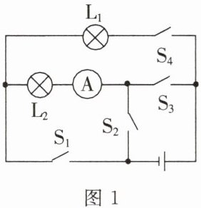 6.如图1所示,先只闭合开关$S_1$、$S_3$、$S_4$,各元件正常工作,再断开$S_4$,电流表示数