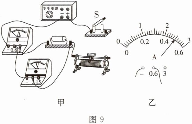 ①在电路中接入$5\ \Omega$的定值电阻,调节滑片,直到电流表达到图 9 乙所示的示数,记录数据;