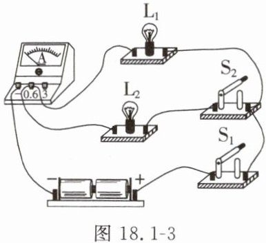 7. 如图18.1-3所示,同时闭合开关$S_1$和$S_2$,小灯泡$L_1$比$L_2$发光暗,电流表有示数。下列分析正确的是(