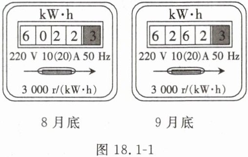 2. 电能表是测量$\boldsymbol{消耗电能多少}$的仪表。某同学家8月底和9月底电能表表盘示数如图18.1-1所示,则该同学家9月份用电$\boldsymbol{240}$$\boldsymbol{kW·h}$。