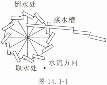 1.《天工开物》是我国古代的科学著作,书中记载着大量的古代农业机械,其中写道:“激轮使转,挽水入筒,一一倾于枧内,流入亩中。”它描述了筒车以水流为动力来取水的方法。如图 14.1-1所示,筒车的工作原理是将水的