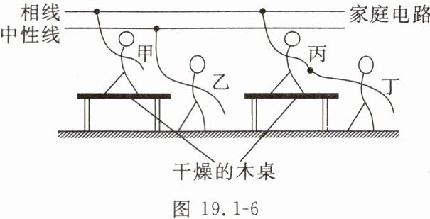 12. 如图19.1-6所示,甲站在干燥的木桌上,一只手接触到相线,乙站在地上,一只手接触到中性线,丙站在干燥的木桌上,一只手接触到相线,此时,丁站在地面上用手去拉丙,则(