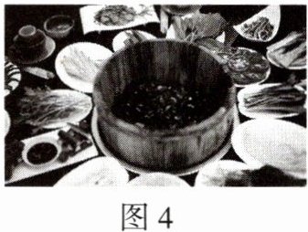 10. 跨学科 > 物理学与日常生活 如图4所示,网红餐饮“木桶鱼”是在木桶里放入高温的鹅卵石,再加入调制好的鱼汤,鱼汤的质量为$2\ kg$、初温为60℃。鹅卵石放热使鱼汤沸腾(不计热量损失,且鱼汤的比热容和沸点视为和水相同,整个过程在标准大气压下进行)。已知鱼汤的比热容$c_{水}=4.2×10^{3}J/(kg·^{\circ}C)$,鹅卵石的比热容是$c_{石}=0.84×10^{3}J/(kg·^{\circ}C)$,铜块的比热容$c_{铜}=0.39×10^{3}J/(kg·^{\circ}C)$。
