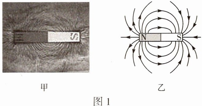 1. 如图 1 甲所示,铁屑在条形磁体周围规律地分布着。磁体两端的铁屑比较密,说明其磁性