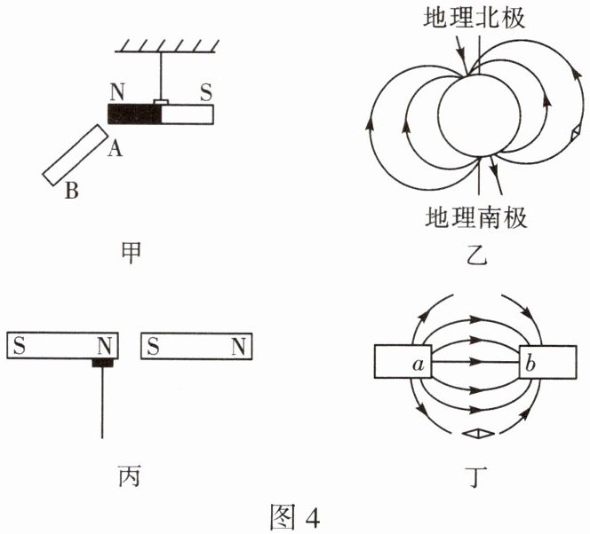 A.甲图让钢棒 AB 靠近条形磁体,若它们相互吸引,则钢棒一定具有磁性