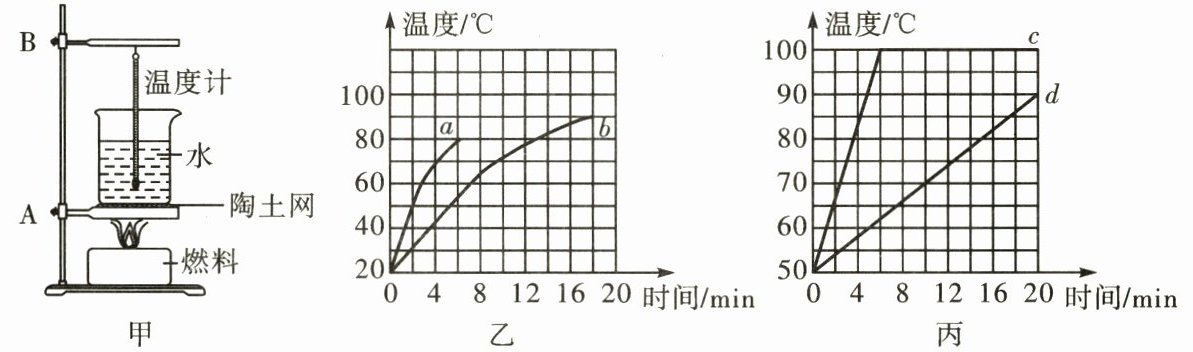 (4)另一组的小华也用与图甲完全相同的两套装置再次进行实验。比较燃料$c$和燃料$d$的热值,并重新在烧杯内加入等质量的水,在燃料烧完后也画出了水的温度随时间变化的图像如图丙,温度计的示数不变,原因是