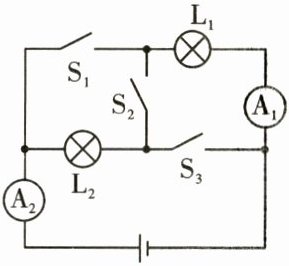 (2)只闭合开关$S_1$和$S_3$时,电流表$A_1$和$A_2$的示数分别为$1\ A$和$1.25\ A$,求通过灯$L_1$和$L_2$的电流。