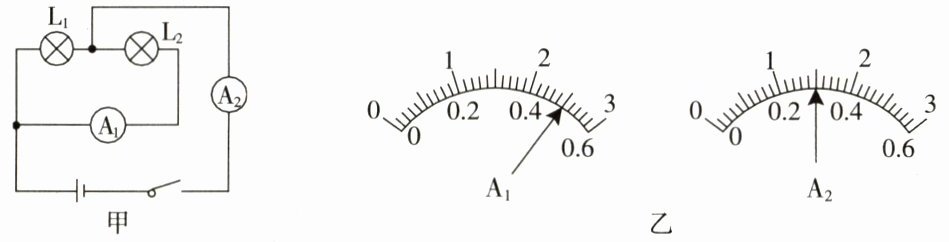16.图甲为某同学做用电流表测量电流的实验的电路图,当闭合开关后,电流表的指针位置如图乙所示,求$A_1$、$A_2$的示数和通过$L_1$的电流。