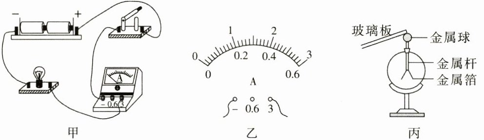 。请在图乙中画出电流为$0.8\ A$时的指针位置。(3)图丙中,验电器是根据