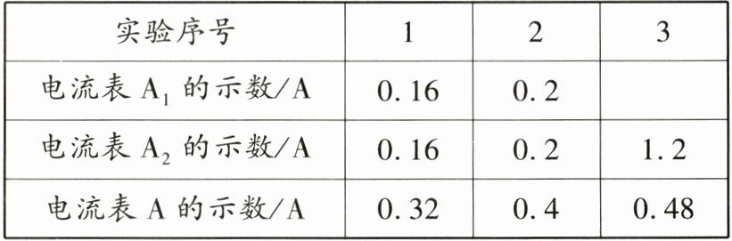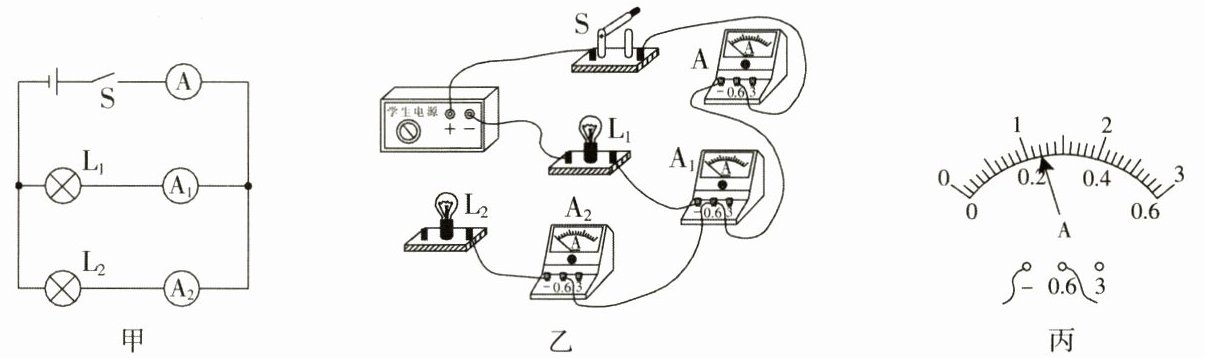 (5)排除故障后,小明用电流表测出通过$L_1$、$L_2$和干路的电流,并通过更换电源进行了三次实验,然后将数据记录在表中,其中第三次实验时电流表$A_1$的指针在图丙的位置,读数为