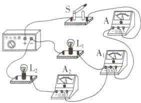 (4)闭合开关后,观察到只有一只灯泡发光,且电流表$A_1$的示数为零,而电流表$A_2$和A的示数相同,电路可能存在的故障是:
