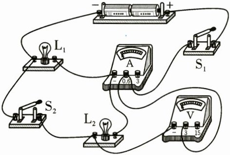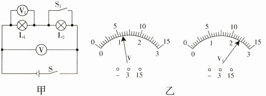15. 如图甲所示,小灯泡$L_1$和$L_2$串联在电路中,只闭合开关S,两电压表的示数如图乙所示。求: