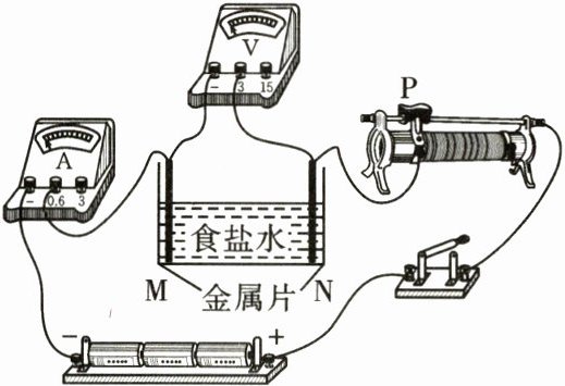 21. 小明探究影响导体电阻大小的因素。他用盛着食盐水的长方体水槽、电源、滑动变阻器、电压表及电流表进行探究。实验电路如图所示,将金属片M、N分别固定在水槽左右两侧底部。
