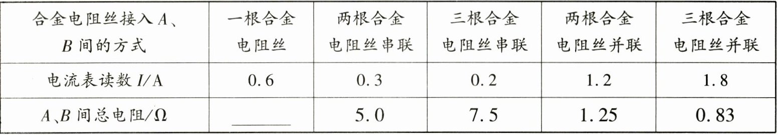 (1)请计算在A、B间接入一根合金电阻丝时A、B间的总电阻,并将其填入表格中相应的位置。