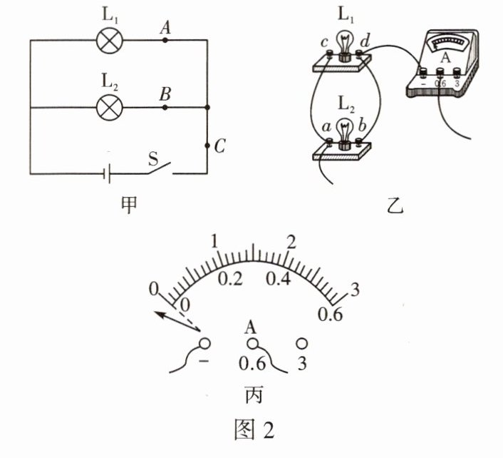 (1)图2乙是某同学连接的并联电路的局部图,测量完干路电流之后,该同学想测量通过$L_1$的电流,为接入电流表,$a$、$b$、$c$、$d$四个接点中,最方便的导线拆接点是