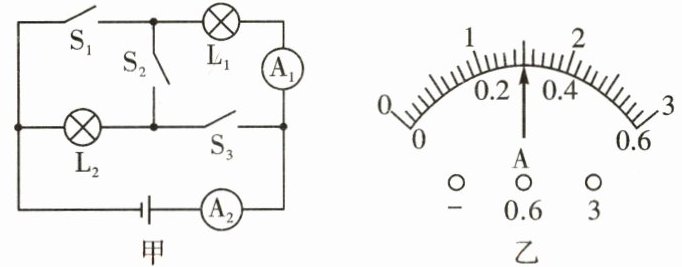 11. 如图甲所示的电路中,只闭合开关$S_1$、$S_3$,两电流表的示数均如图乙,下列说法正确的是