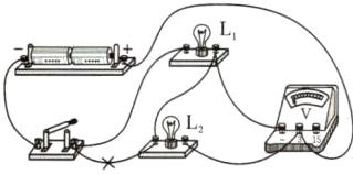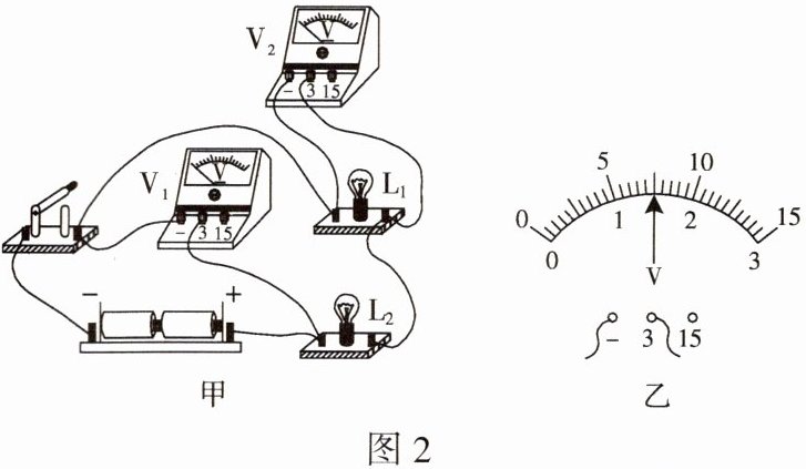 (1) 灯泡 $L_1$、$L_2$ 发光时,电压表 $V_1$ 的示数为 $2.8\ V$,电压表 $V_2$ 的示数如图 2 乙所示。