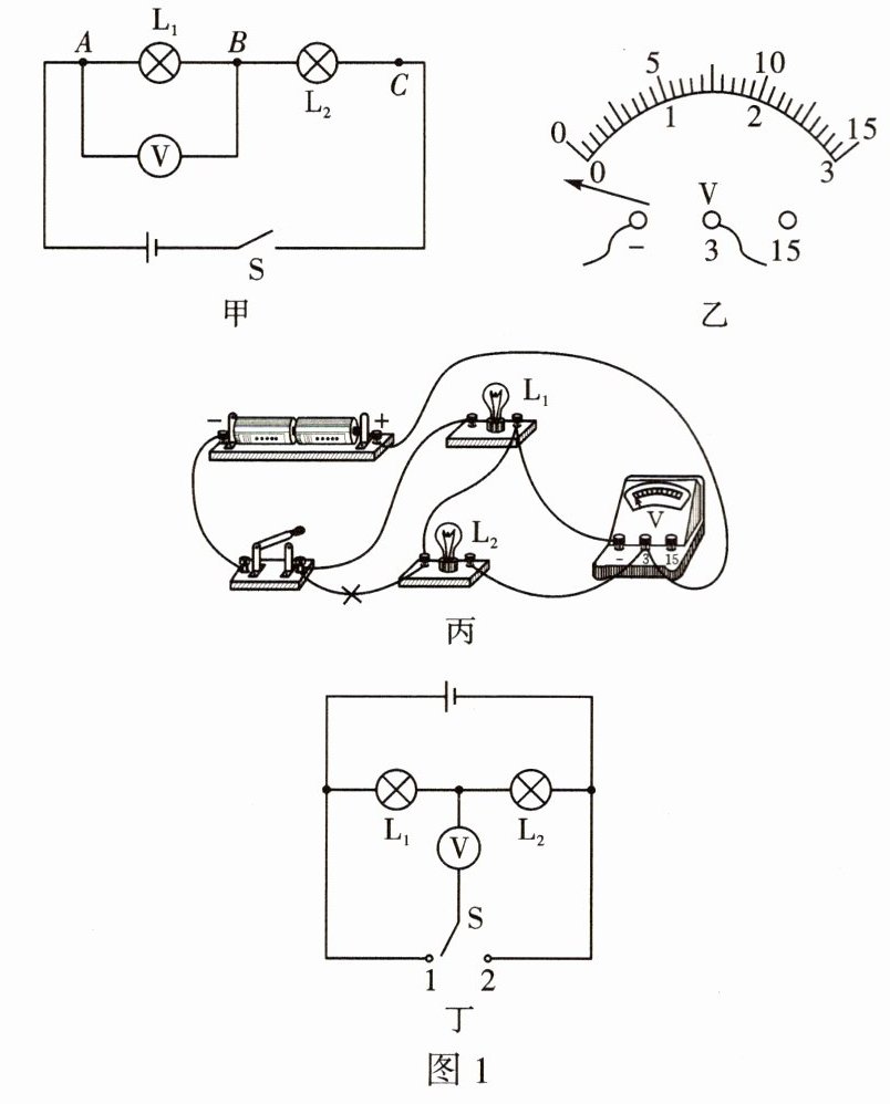 。(5) 小华观察了小明的实验后,觉得拆装电压表操作过于麻烦,于是他设计了如图 1 丁所示的电路图,认为不用拆接电压表就能测出 $L_1$ 和 $L_2$ 两端的电压。他的设计不合理,理由是