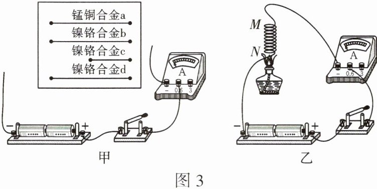 (4)把一段钨丝 MN 连接在电路中,如图 3 乙,闭合开关,用酒精灯给钨丝加热,发现电流表示数变小,这表明:温度升高,钨丝的电阻变